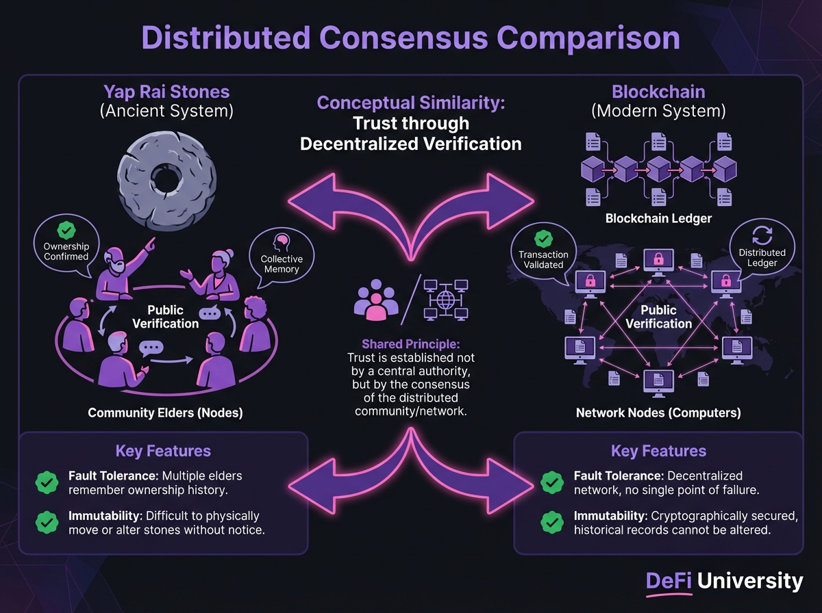 1. Distributed State: The "ledger" of ownership was not held in a central bank vault or a single king's scroll. It was distributed across the minds of the community elders. Each elder acted as a "node" in the network, maintaining a mental record of the current state of ownership for every stone on the island.