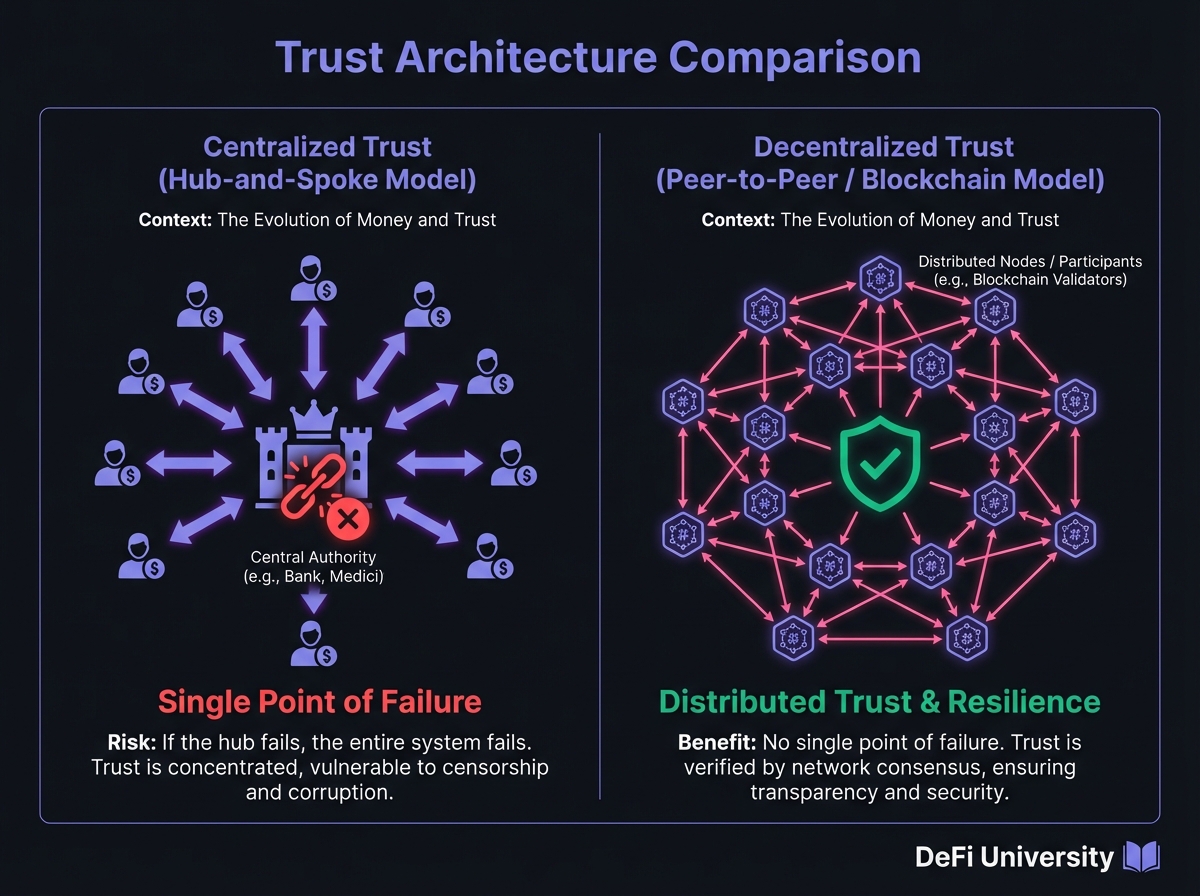 The Philosophical Shift: This marked the fundamental philosophical shift from Institutional Trust (trusting a bank, a government, or the Medicis) to Programmatic Trust (trusting code, mathematics, and consensus). In this new paradigm, value transfer does not require a "hub." It is Peer-to-Peer, censorship-resistant, and verified by a decentralized consensus mechanism rather than a boardroom decree.