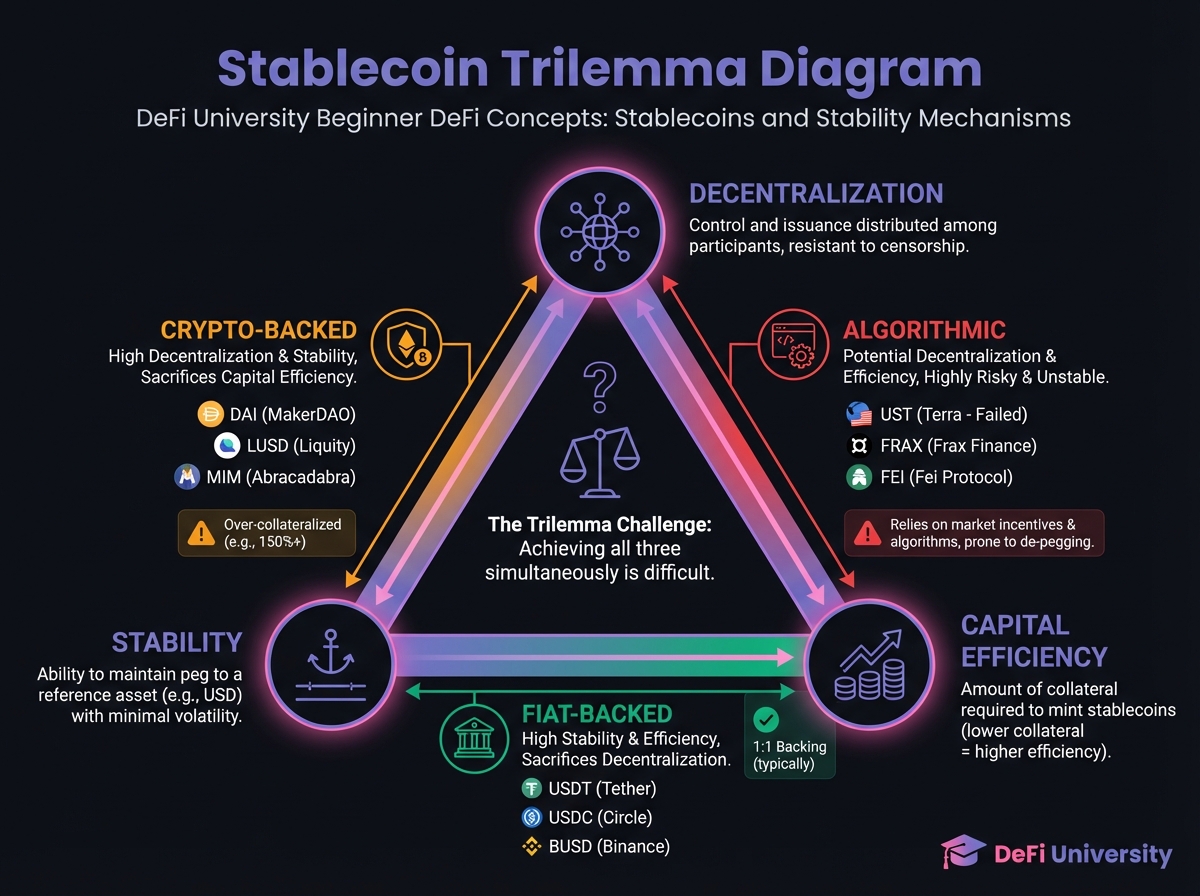 Cryptocurrencies are volatile; a functional financial system requires a stable unit of account. Stablecoins bridge this gap, but their design is constrained by the Stablecoin Trilemma: a stablecoin can only optimize for two of three properties—Decentralization, Stability, and Capital Efficiency.