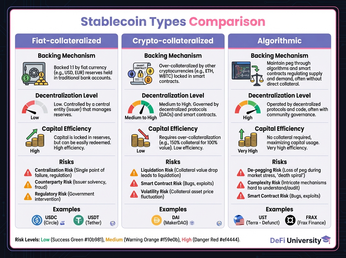 A centralized entity holds $1 in a bank account for every 1 token issued. These are capital efficient (1:1 backing) but suffer from centralization risk (custodian can freeze funds).