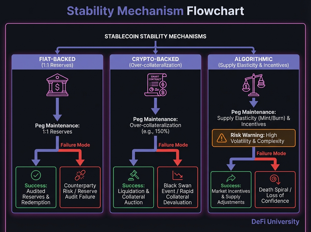 These attempt to maintain a peg via supply elasticity and incentives rather than full collateral backing. History (e.g., Terra/Luna) suggests these are highly risky and prone to "death spirals."