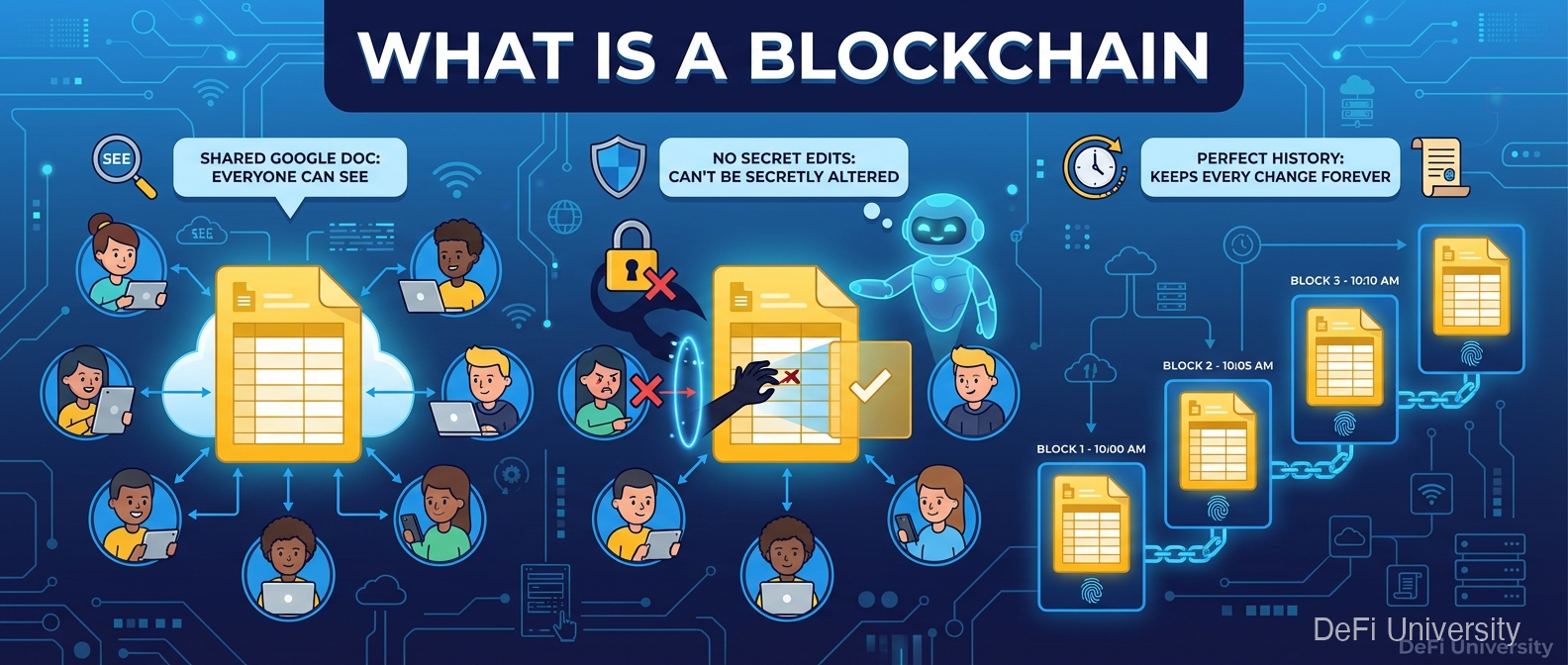 Core concept: A blockchain is like a shared Google Doc that everyone can see, no one can secretly edit, and which keeps a perfect history of every change ever made.