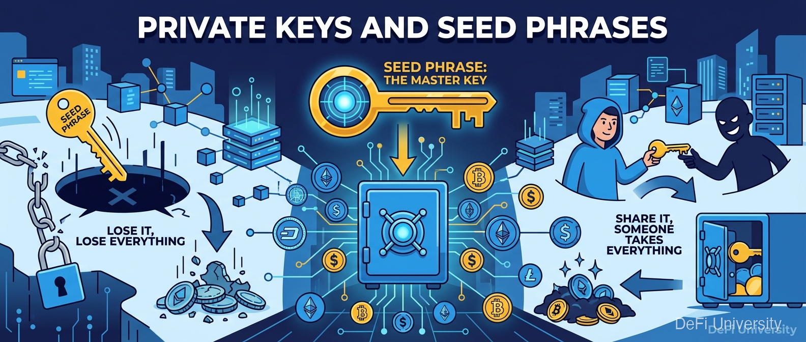 Core concept: Your seed phrase is the master key to all your crypto—lose it and you lose everything, share it and someone takes everything.