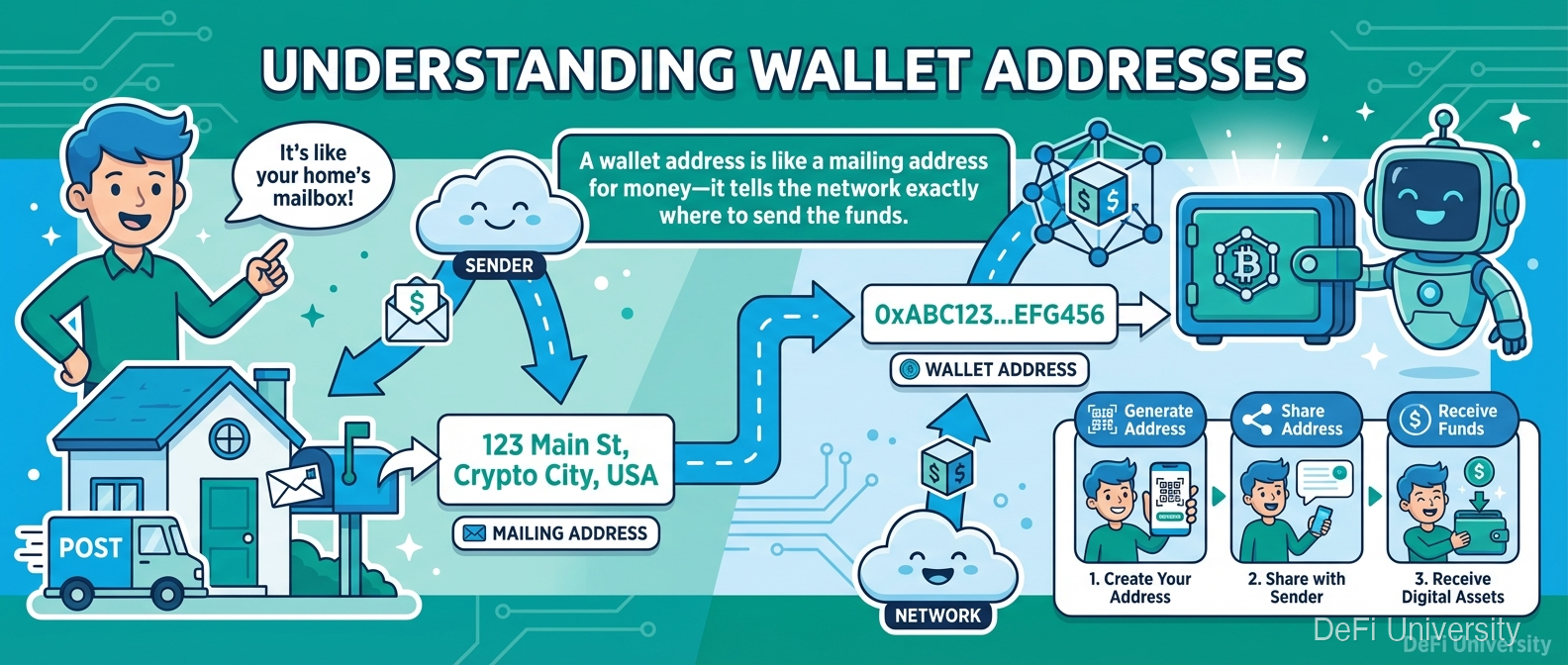 Core concept: A wallet address is like a mailing address for money—it tells the network exactly where to send the funds.