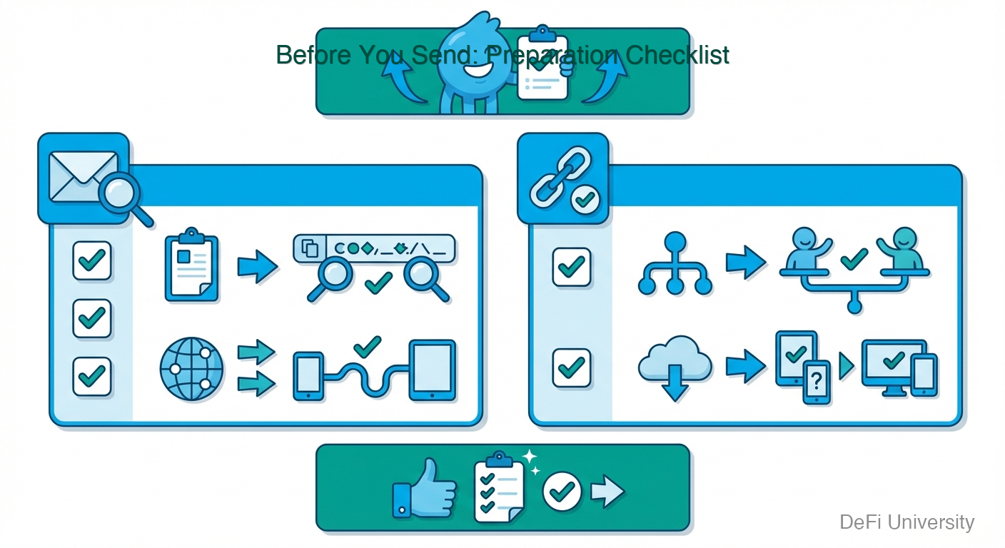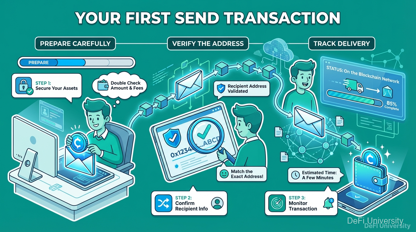 Core concept: Sending crypto is like mailing a valuable package—prepare carefully, verify the address, and track delivery.