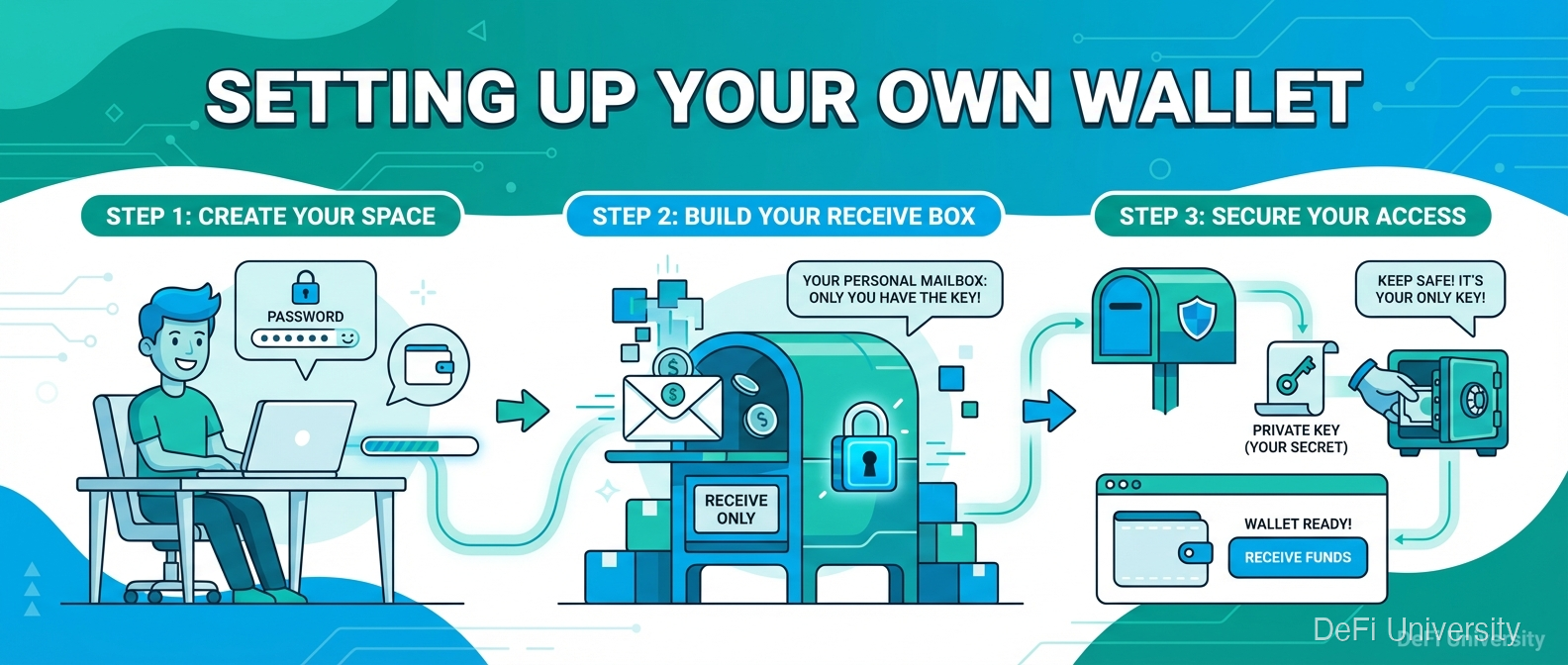 Core concept: Setting up a crypto wallet is like setting up a new mailbox—you're creating a destination for receiving funds that only you can access.