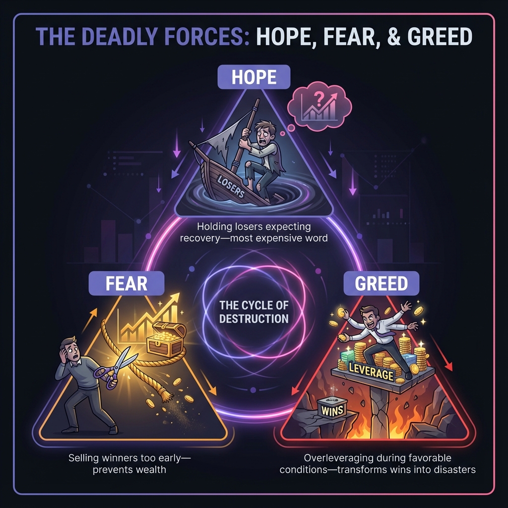 The cruel irony: Hope makes you hold when you should sell, fear makes you sell when you should hold, and greed makes you buy when you should wait.