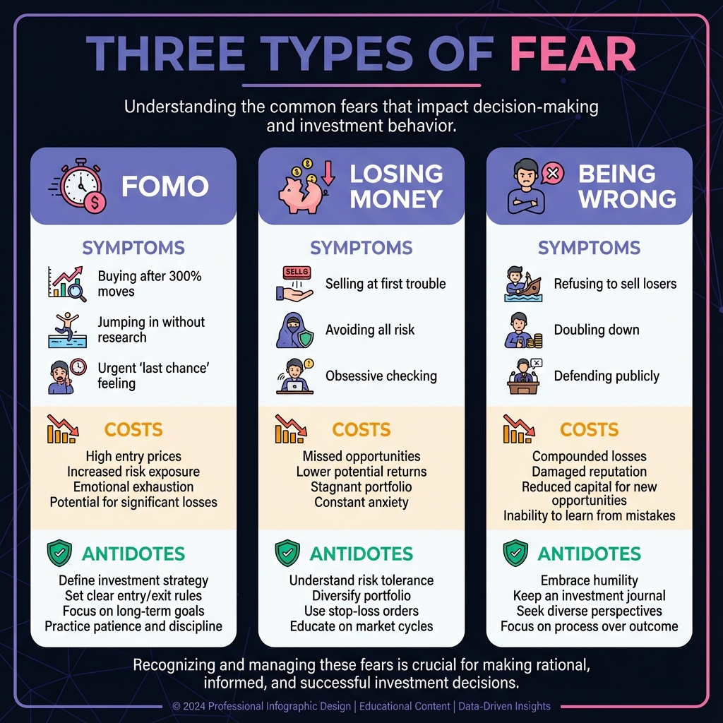 Fear Type 3: Fear of Being Wrong ๐ฏ The Symptoms: Refusing to sell losing positions to avoid admitting mistakes, doubling down on failures to prove you're right, defending bad investments publicly.
