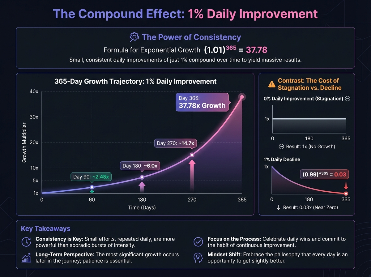 The math is undeniable: (1.01)^365 = 37.78. Small improvements create exponential results.