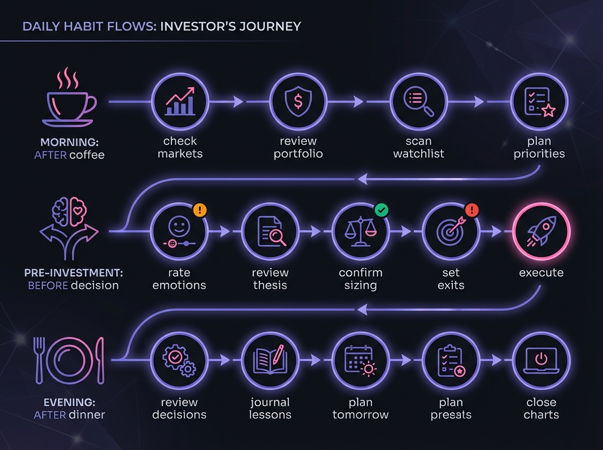 🌃 Evening Stack: After dinner → I review today's decisions After I review decisions → I journal key lessons After I journal → I plan tomorrow's focus After I plan tomorrow → I close all price charts