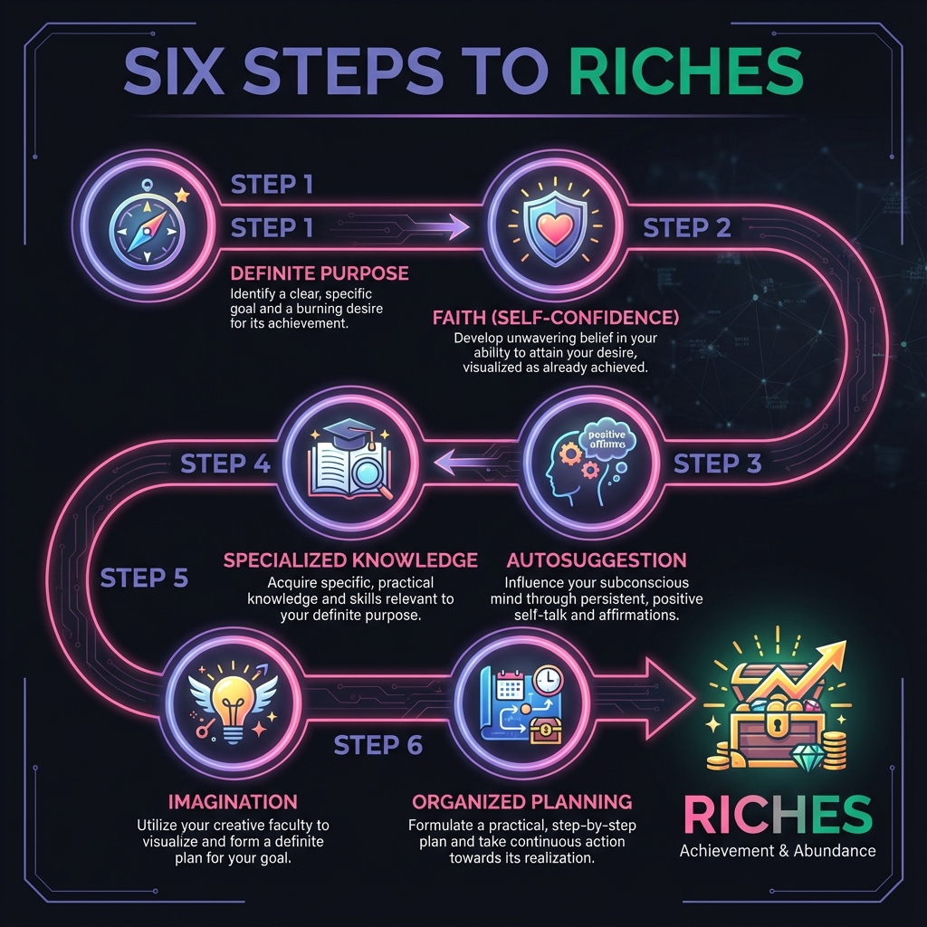 2. The Six Steps to DeFi Riches - Definite Purpose, Mental Programming, Specialized Knowledge, Comprehensive Planning, Psychological Resilience, and Mastermind Principle