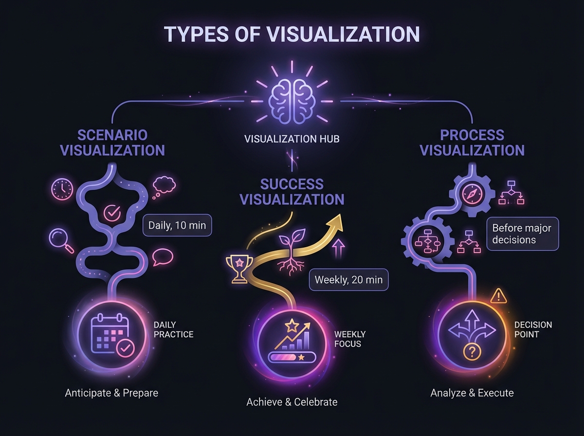 Process Visualization (Before major decisions) ensures flawless execution. Mentally rehearse your research and analysis process step by step. Visualize following your discipline and rules perfectly without deviation. See yourself making decisions from a calm, rational state regardless of market conditions. Picture successful execution of your strategy from start to finish.