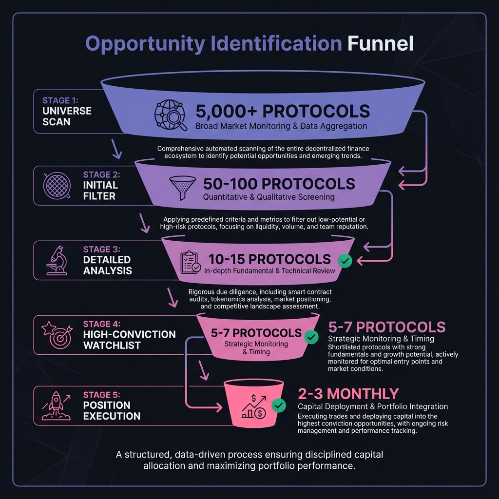 The DeFi Opportunity Funnel systematically narrows thousands of possibilities to handful of high-conviction plays.