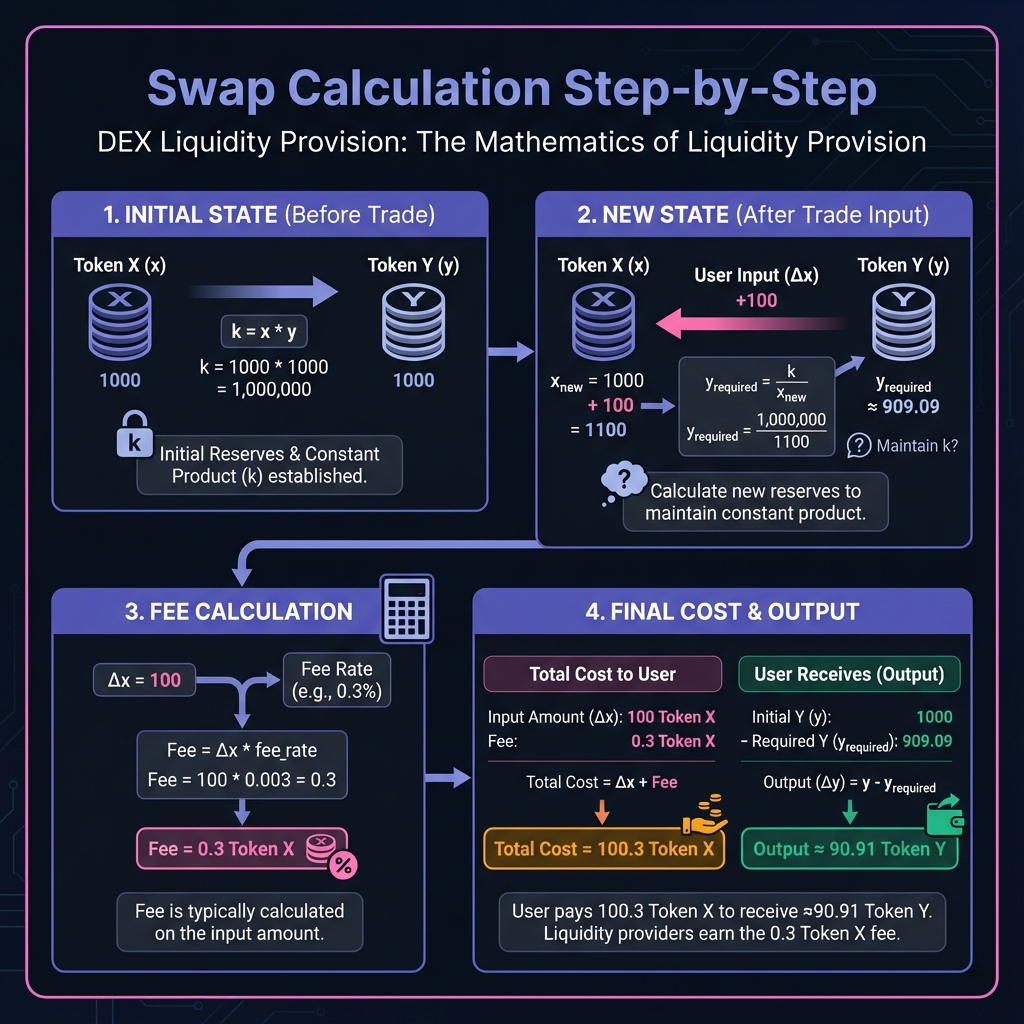 With fees (fee rate φ, e.g., 0.003 for 0.3%): (x+Δx⋅(1−ϕ))⋅(y−Δy)=k