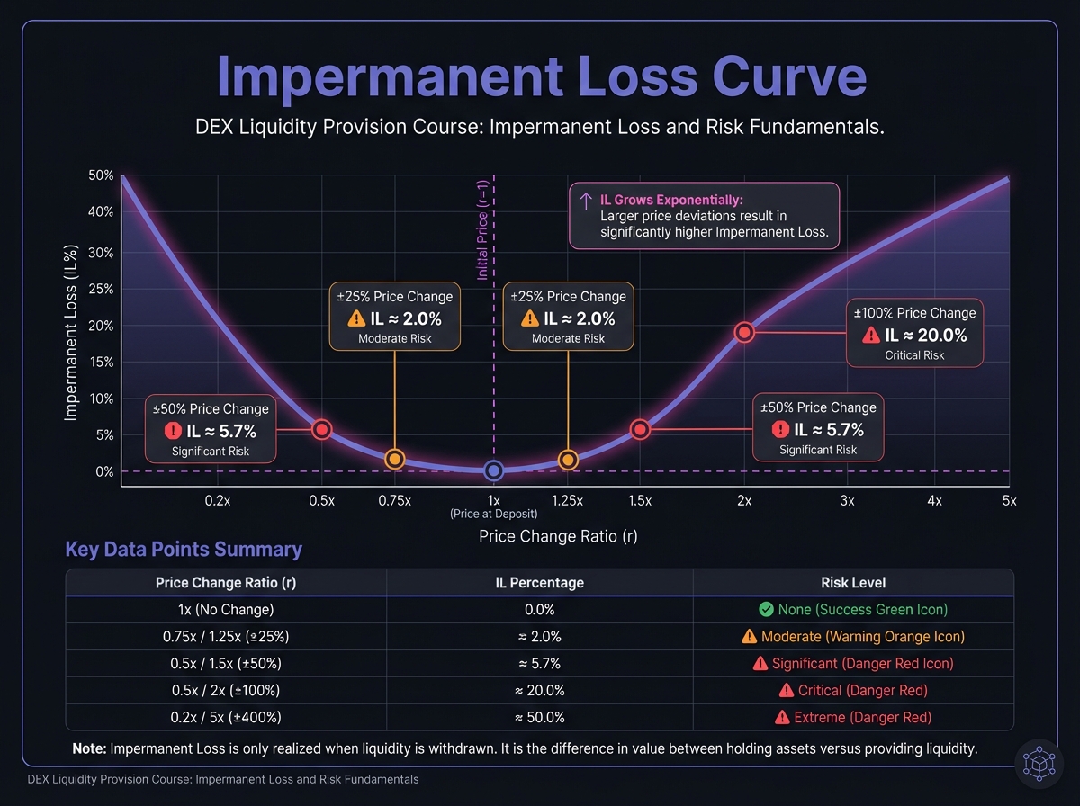 Key Insight: IL grows exponentially with price divergence. A 2x price move causes 20% IL. A 4x move causes 50% IL!