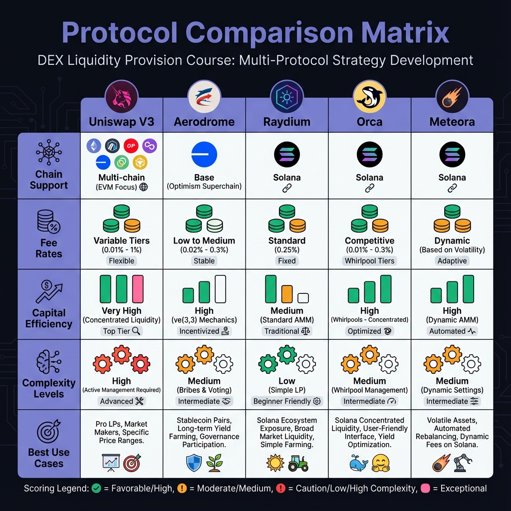 Different DEX protocols excel in different scenarios. Mastering multiple protocols lets you optimize returns across ecosystems, chains, and market conditions. This lesson compares Uniswap, Aerodrome, Raydium, Orca, and Meteora to help you choose the right tool for each situation.