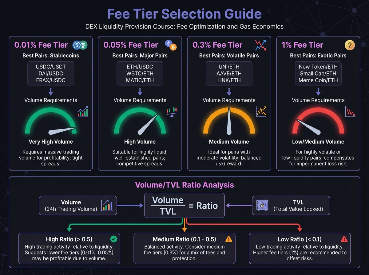 Target: Volume/TVL ratio > 0.3 Benefit: Maximum fees per dollar Risk: May have higher competition