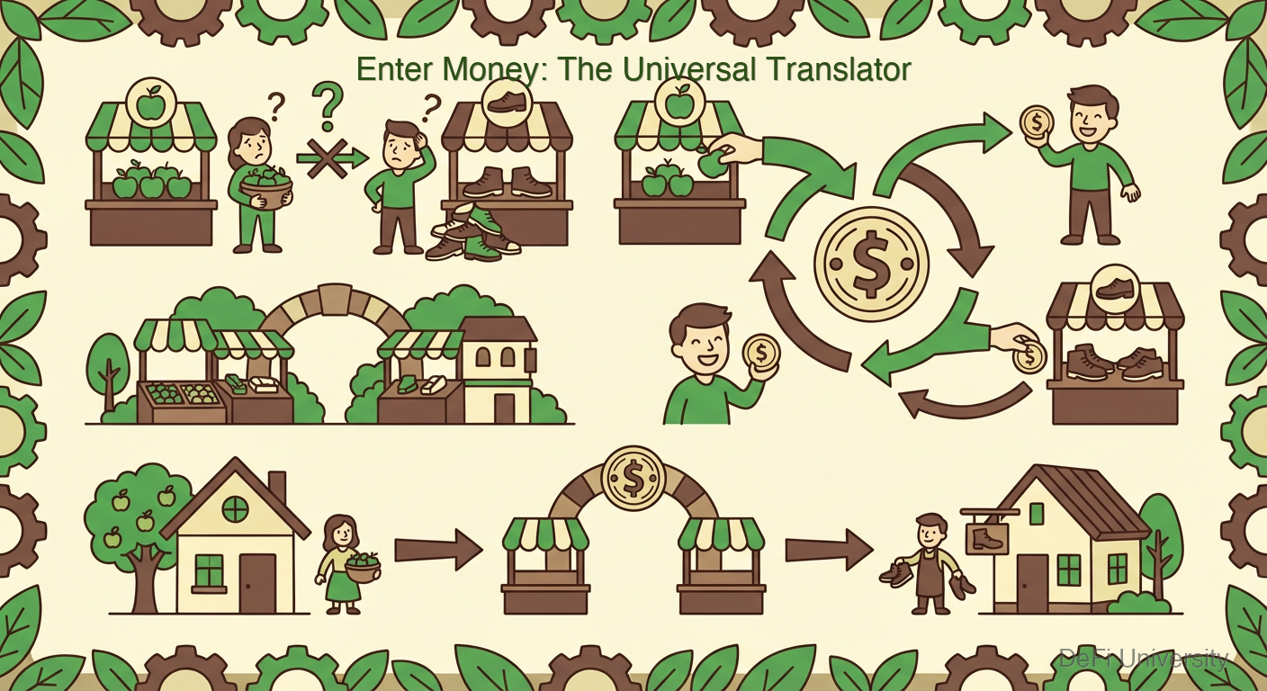 Money gives us a standard way to measure value. Instead of saying "these shoes are worth 50 apples," we say "these shoes cost $80." It's like having a ruler for value—everyone measures using the same units.