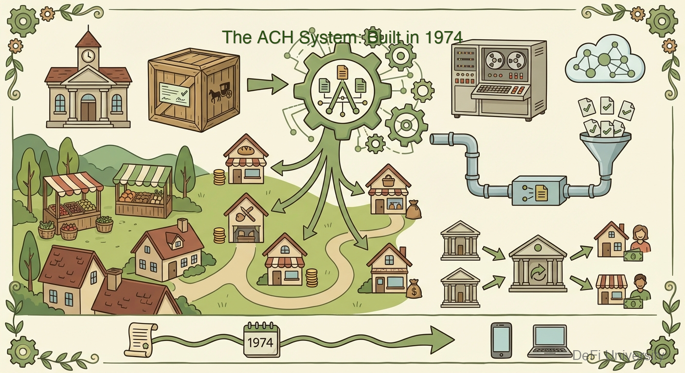 Most bank transfers in the US go through ACH—the Automated Clearing House. It was created in 1974 to replace physical check transport between banks.