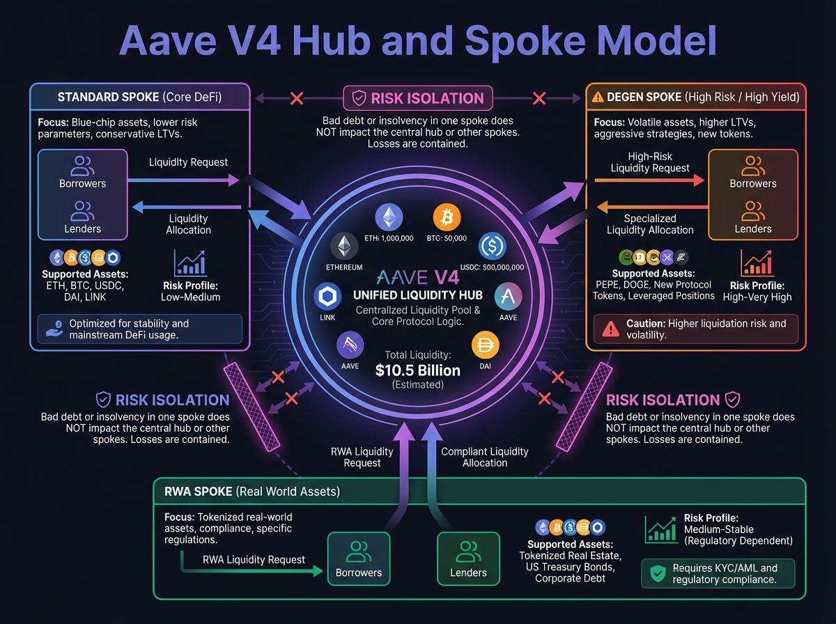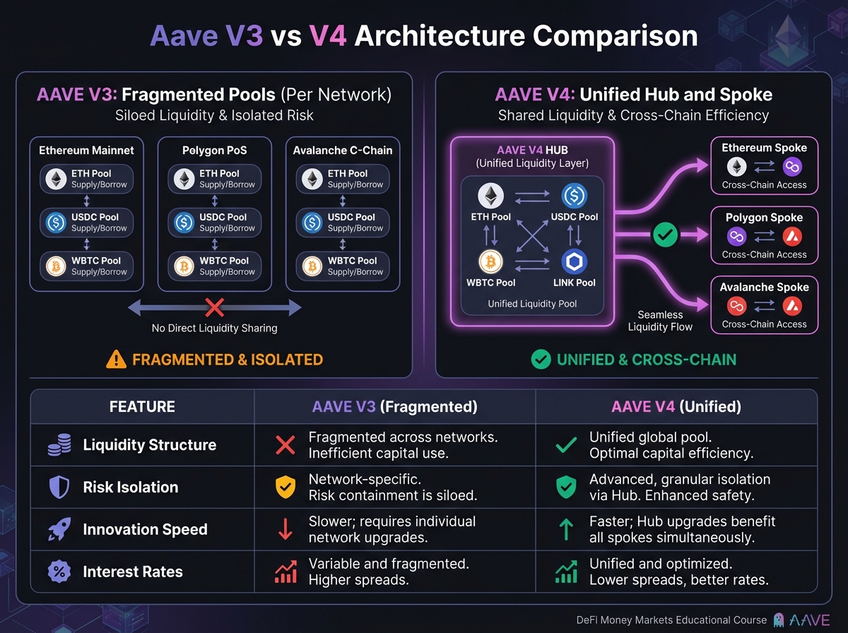 Aave stands as the undisputed leader in decentralized lending, managing over $70 billion in total value locked (TVL) and commanding approximately 60% market share. Its dominance stems from a "safety-first" approach, extensive auditing, and strategic evolution from V3's fragmented pools to V4's unified Hub and Spoke architecture.