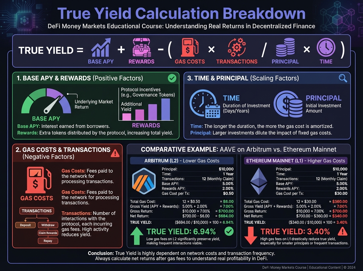 True Yield Formula: TrueYield=BaseAPY+RewardsGasCosts×TransactionsPrincipal×TimeTrue Yield = Base APY + Rewards - \frac{Gas Costs \times Transactions}{Principal \times Time}