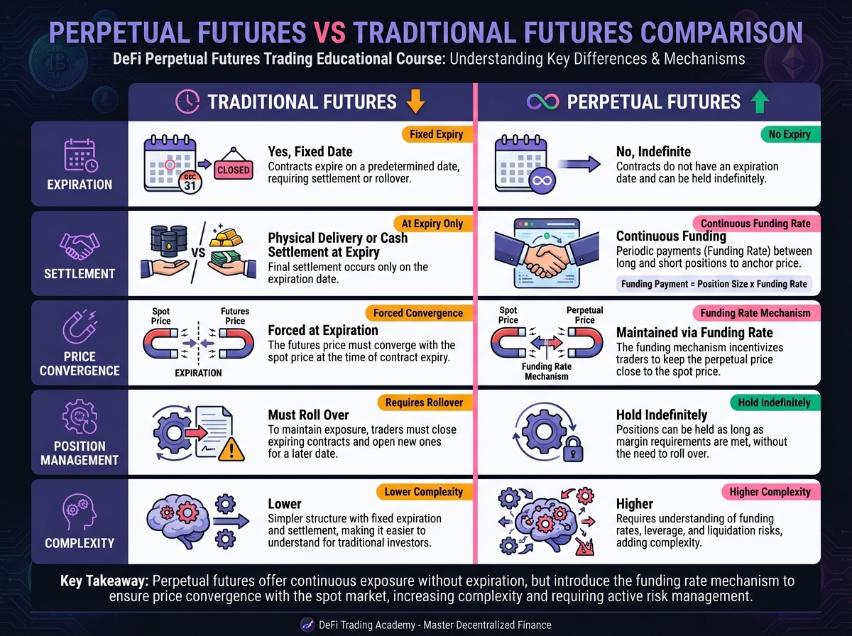 Key Innovation: Instead of forcing price convergence through expiration, perpetuals use periodic funding payments to incentivize arbitrage and maintain price parity with spot markets.