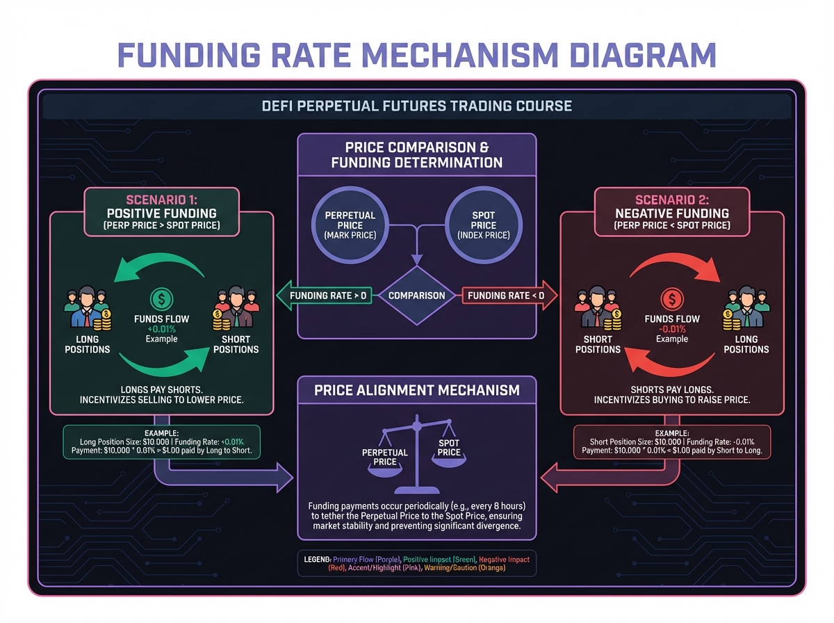 Q: Why do I pay funding rates? A: Funding rates keep the perpetual price aligned with the spot price. If you're long and funding is positive, you pay shorts. This prevents the perpetual from trading too far above spot.