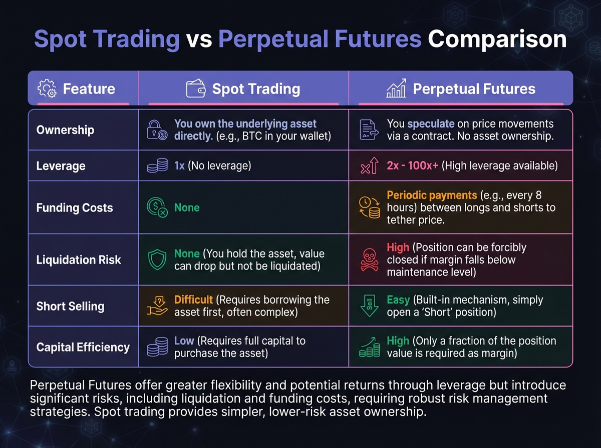 Q: What's the difference between perpetuals and spot trading? A: Spot trading means you own the asset. Perpetuals let you speculate on price without owning it, using leverage. You can go long (bet price goes up) or short (bet price goes down).