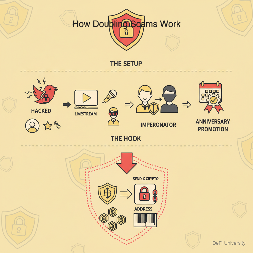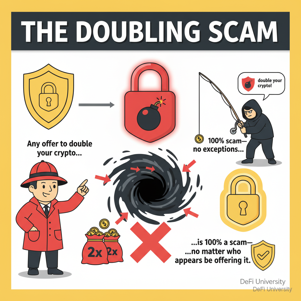 Core concept: Any offer to double your crypto if you send it somewhere is 100% a scam—no exceptions, no matter who appears to be offering it.