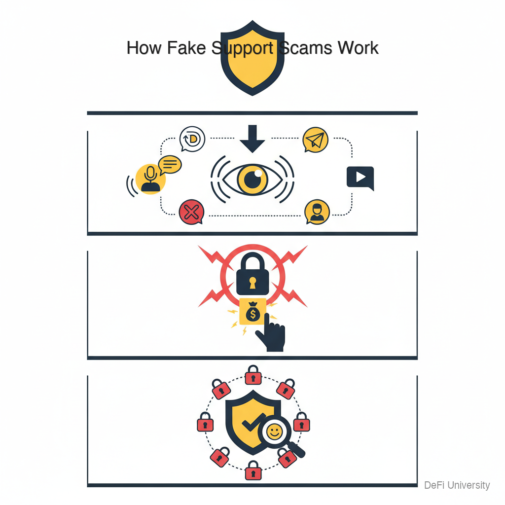 Core concept: Scammers impersonate customer support from exchanges, wallet providers, and projects to trick you into revealing credentials or approving malicious transactions.