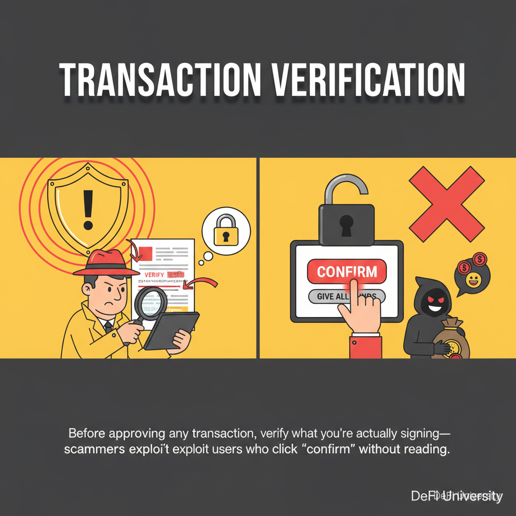 Core concept: Before approving any transaction, verify what you're actually signing—scammers exploit users who click "confirm" without reading.